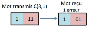La correction se fait par la distance de Hamming minimale avec les mots possibles (il n’y a que 2 mots possibles), donc le mot décodé est 1.