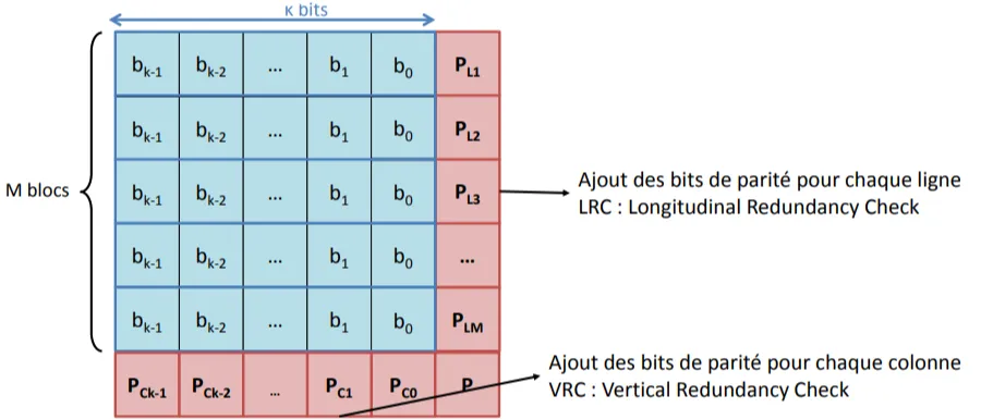 Redondance : 1+k+M (k correspond aux bits de VRC et M aux bits de LRC + le bit au croisement des 2)