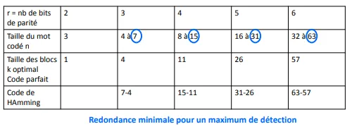 ⇒ pour un mot de k bits → ajout de r bits de contrôle , donc la longueur totale du message est 2 r − 1 2^{r}-1 2 r − 1 (car le bit de parité se trouve sur les positions des puissances de 2)