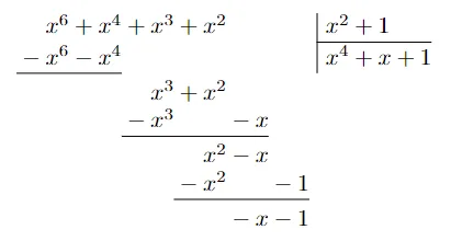On calcule donc x 6 + x 4 + x 3 + x 2 x 2 + 1 \frac{x^{6}+x^{4}+x^{3}+x^{2}}{x^{2}+1} x 2 + 1 x 6 + x 4 + x 3 + x 2